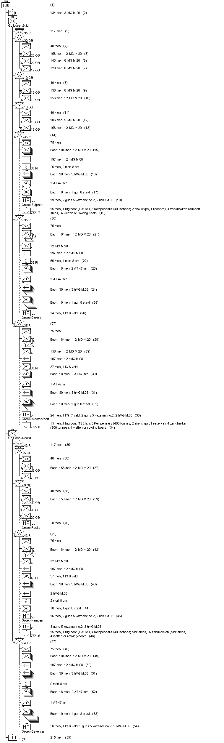 55. In TBO according to: Klingens, Krijgsvolk, p.56; personnel strength: Supplement, p.39-40; elements detached to Groep Betuwe.