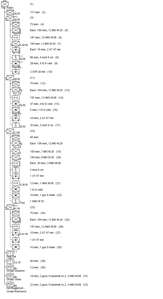 21. Unit identification: De verdediging van Noord-Limburg en Noord-Brabant, p.117; personnel strength: Oorlogsorganisatiën, p.101.
