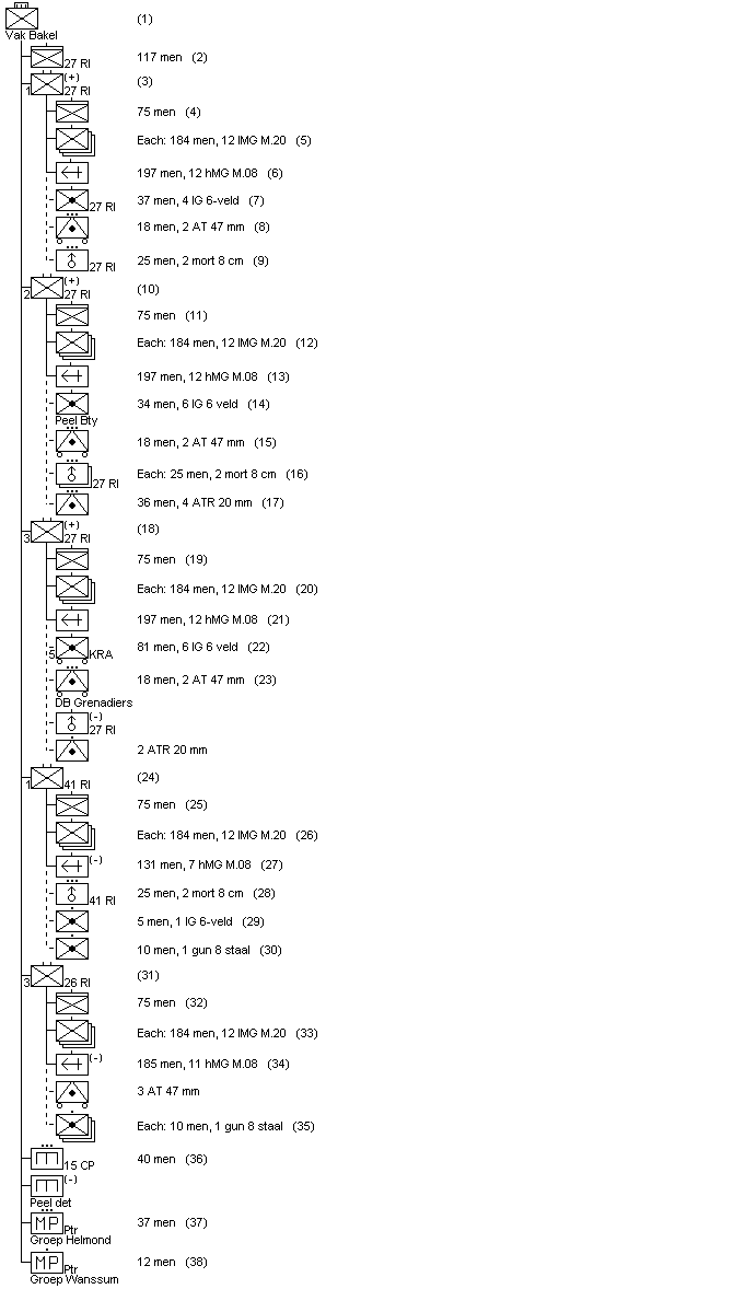 27. Minus two platoons (one of these platoons minus one hMG). Personnel strength: Oorlogsorganisatiën, p.100-101; gun strength: De verdediging van Noord-Limburg en Noord-Brabant, p.12 and 133.